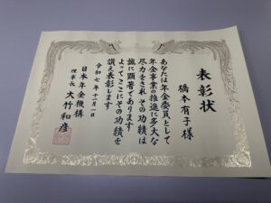 2025/11/27 ニュース 管理本部担当取締役が日本年金機構理事長表彰を受賞いたしました 11月21日年金委員・健康保険委員功労者表彰式にて、管理本部担当取締役が日本年金機構理事長表彰を受賞いたしました